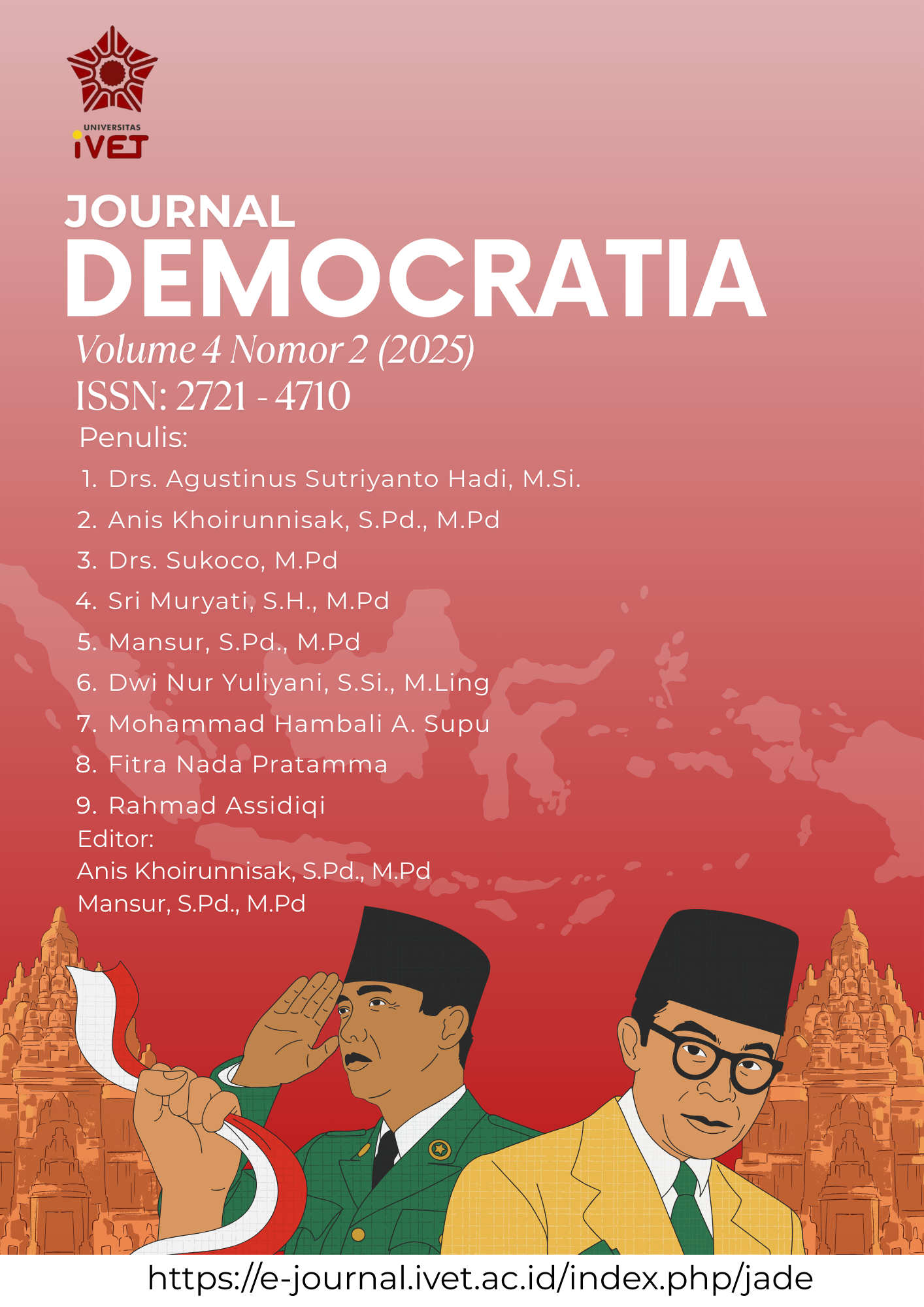 Vol 4 No 2 (2025)Jurnal Democratia Ivet adalah jurnal prodi PPKn yang menerbitkan jurnal dengan tema Pendidikan Pancasila dan Kewarganegaraan, Moral, Karakter, dan Hukum
